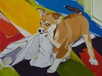 2010Dit is het tweede werk uit de serie De lundehund als pup. Hier speelt Svadil met zijn kleed.