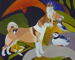 2010Oorspronkelijk jaagde de lundehund op de papegaaiduiker op de Lofoten in Noorwegen. Hier zien we de snavel van de papegaaiduiker en de kop van een lundehund. Dit is het eerste schilderij in een serie van 3.